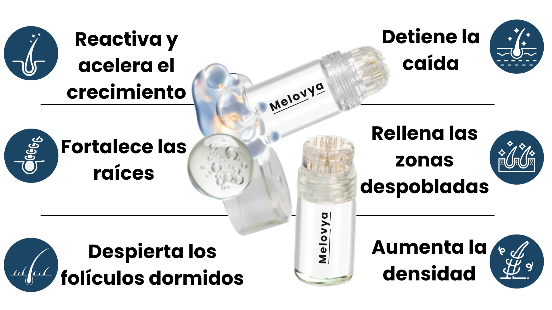 Devuelve la vida a tu cabello con el sistema Melovya. Gracias a su tecnología de microinfusión, estimula directamente los folículos desde la raíz con potentes activos. Resultado: un cabello más denso, más fuerte y con menos caída. Recupera por fin tu confianza y libertad.